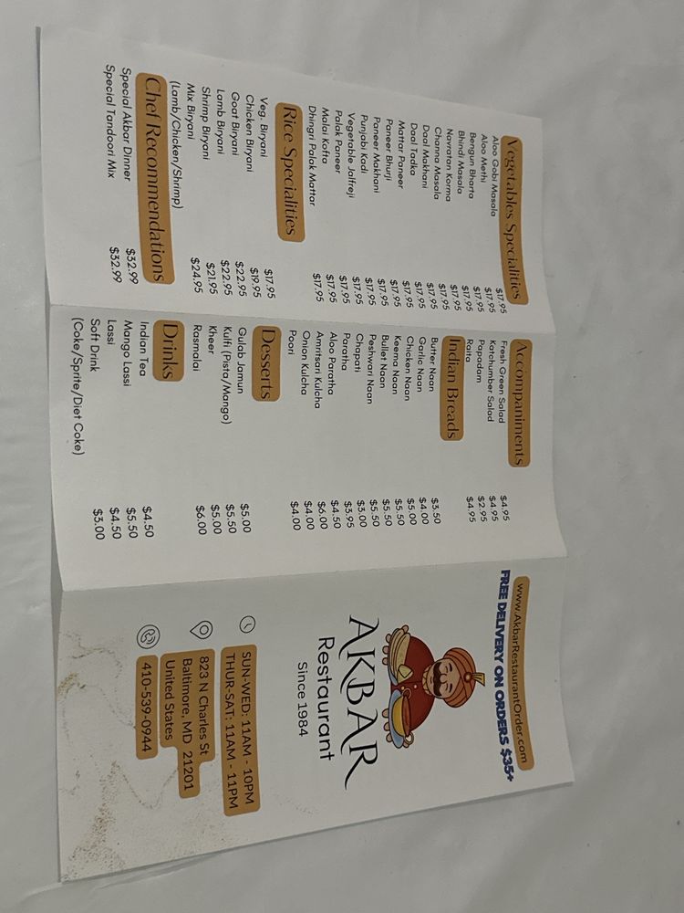 Welcome to Akbar Restaurant, a hidden gem nestled at 823 N Charles St in Baltimore, where Indian cuisine comes alive with vibrant flavors. This cozy, intimate setting is perfect for a meal before a show or a late-night craving. The menu boasts a delightful array of dishes, including garlic naan that has earned rave reviews, and a standout Biryani Rice with Shrimp, known for its aromatic spices and tender shrimp that speak to the heart of Indian cooking.